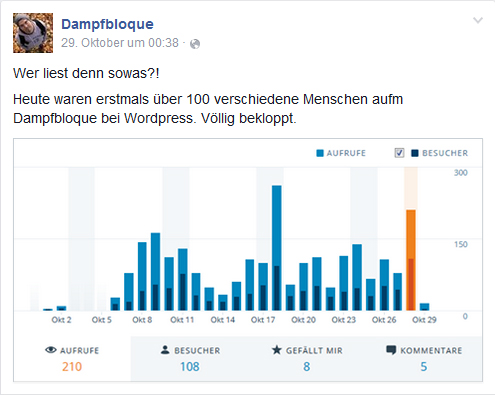 Ich habe es vor Kurzem erst beim Facebook-Ableger verlauten lassen: Ich bin erstaunt, überrascht und erstaunt darüber sowie angetan davon, dass jemand meine geistigen Abfallprodukte des Alltags tatsächlich durchliest.